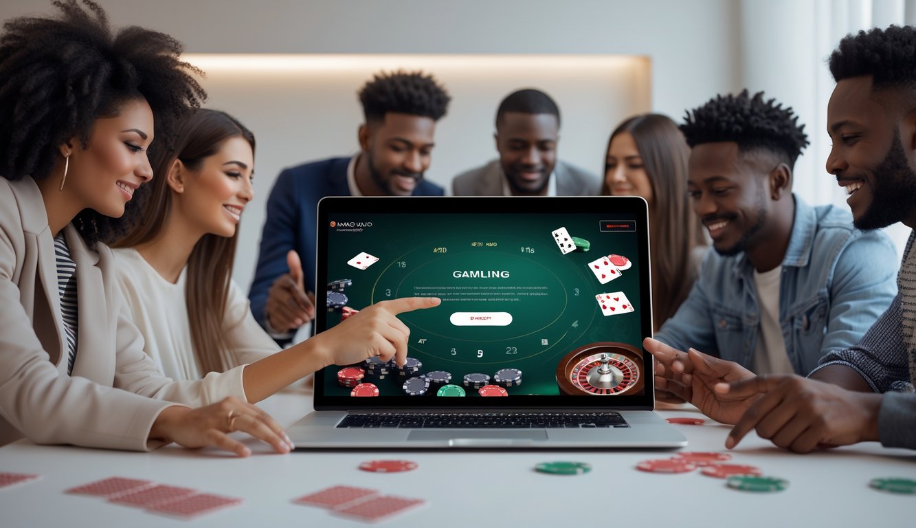 Sekelompok orang muda menggunakan laptop dengan tampilan situs judi online yang modern dan mudah digunakan di meja bersih.