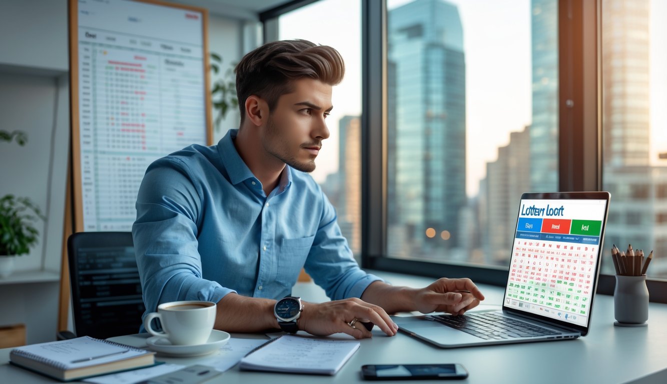 Seorang pria muda duduk di meja modern dengan laptop terbuka, menganalisis data dan catatan terkait strategi togel online, di ruang kerja yang rapi dengan jendela besar dan pemandangan kota.